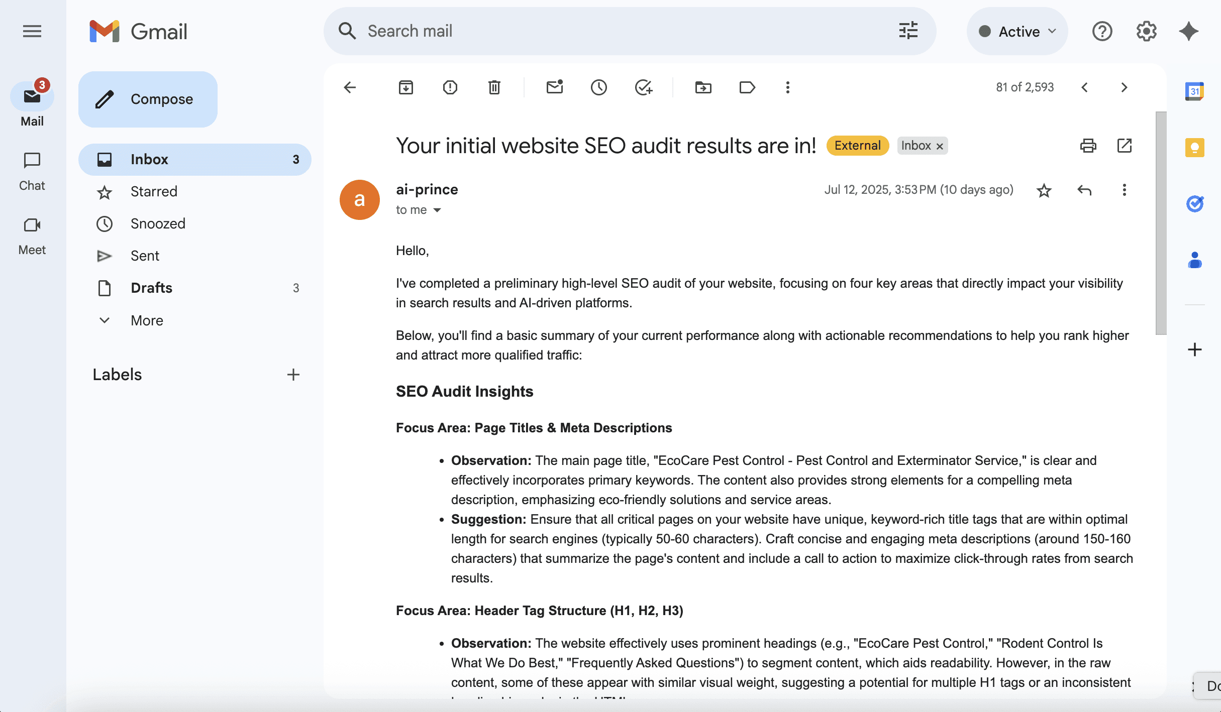 Email Agent can conduct in-depth audits (deep technical and content insights) of your website.